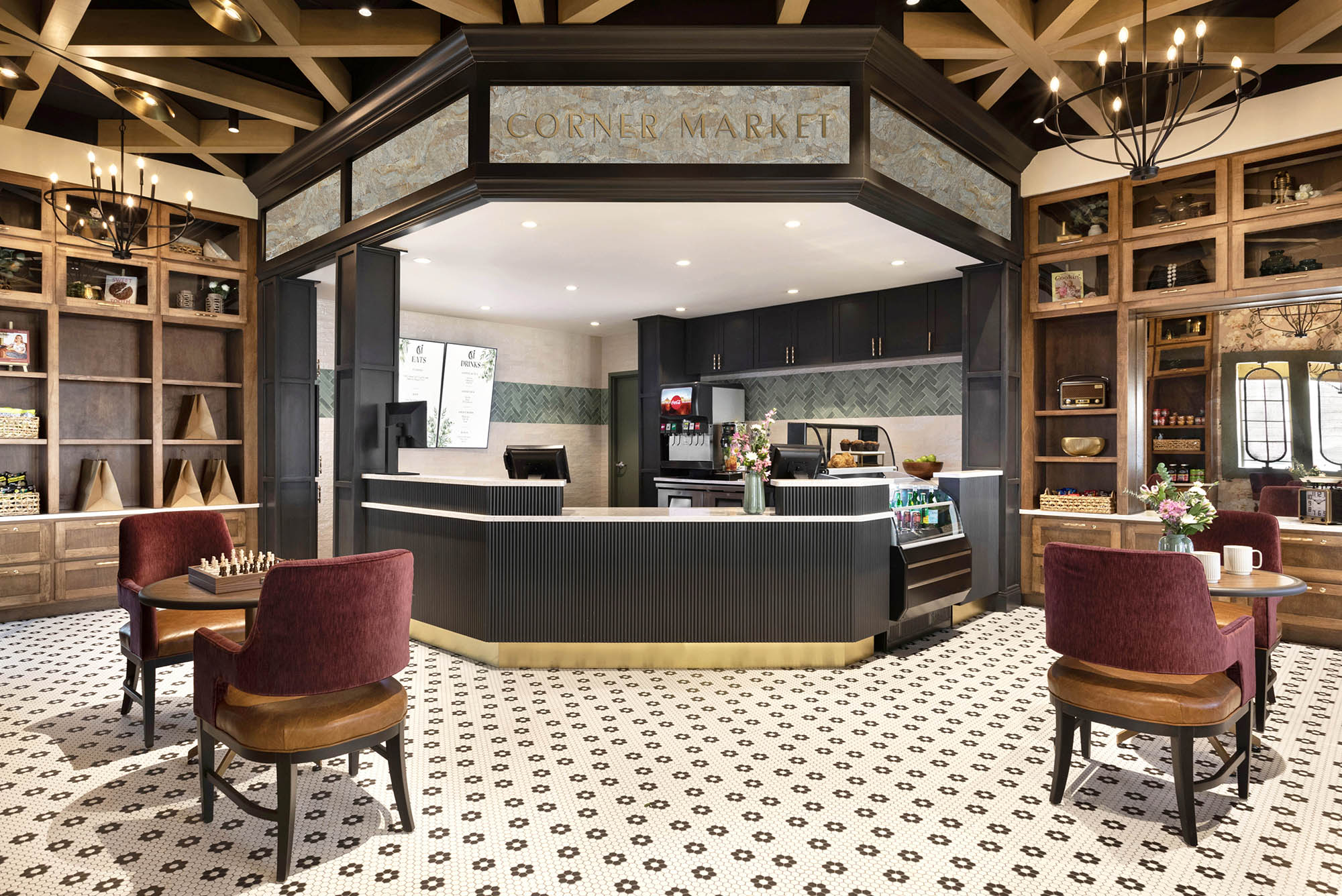 Situated at a prominent corridor intersection, the existing footprint posed spatial and functional challenges. The design team overcame these by maximizing every square inch, integrating retail and food service seamlessly within a compact area. Drawing inspiration from historic town boutique cafés and markets, the new Corner Market blends traditional architectural detailing with modern touches—custom millwork, a welcoming café counter, and playful yet elegant patterns—to create a destination that feels both fresh and familiar.